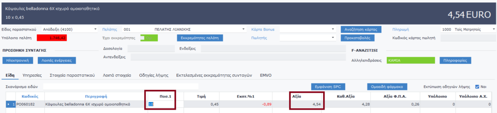 Για να καταγράψετε μία Λιανική πώληση ενός ομοιοπαθητικού, απλά ανοίγετε τη Λιανική PharmacyOne, εισάγετε τον προϊόν και τροποποιείτε την ποσότητά του. Αυτόματα τροποποιείται η συνολική αξία της γραμμής, σύμφωνα με τον τρέχοντα τιμοκατάλογο ομοιοπαθητικών.
