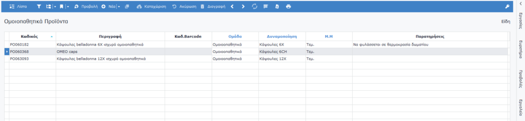 Προσοχή: Για να μπορείτε να χρησιμοποιείτε το module της διαχείρισης ομοιοπαθητικών, θα πρέπει να δημιουργείτε είδη, συστατικά και πρώτες ύλες αποκλειστικά με αντιγραφή από ήδη υπάρχοντα.