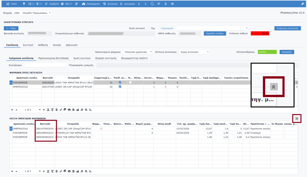 Για να ελέγξετε αν το σκεύασμα συμπεριλαμβάνετε σε αυτά που επιτρέπει η ΗΔΥΚΑ, μπορείτε να εμφανίσετε τη λίστα όλων των Φαρμάκων προς εκτέλεση, από το εικονίδιο με τα δύο βελάκια που εμφανίζεται στην παρακάτω εικόνα και να ελέγξετε τα barcodes που περιλαμβάνει η συνταγή.