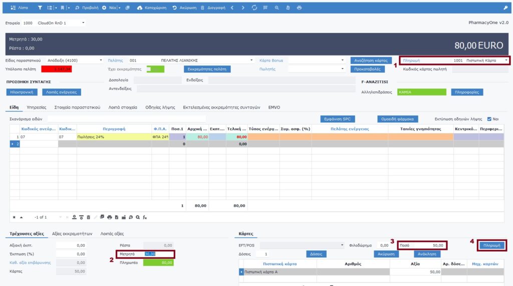 - Η συναλλαγή καταχωρείται με το ποσό και τον αριθμό κάρτας.